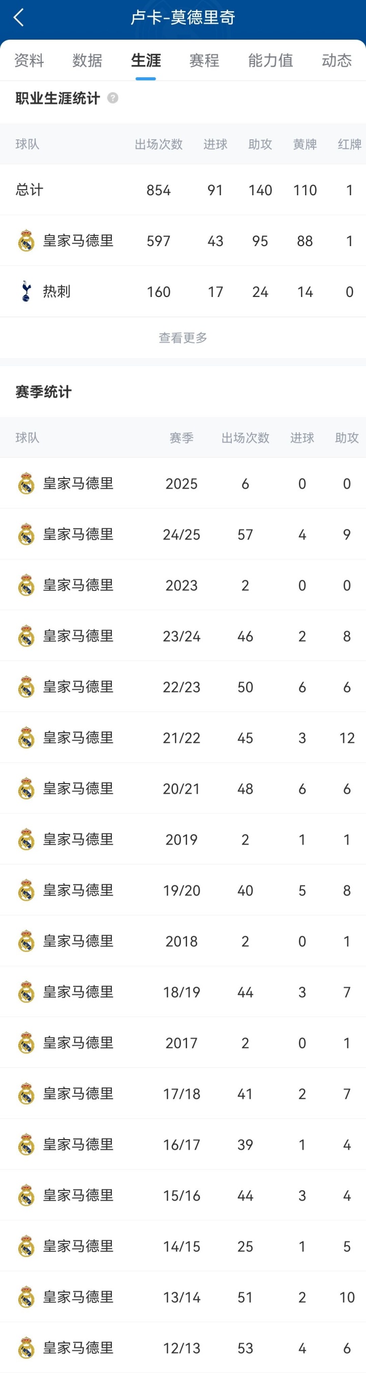 莫德里克(Modric)于2012年加入了皇家馬德里(Real Madrid)。他在13年內進行了597場比賽,打進43球并協助95次比賽,幫助球隊贏得28冠軍獎杯:6個冠軍聯賽,6個俱樂部世界杯,5個歐洲超級杯,4個La Liga,2杯杯,2杯德爾·埃爾·雷伊和5個西班牙超級杯。